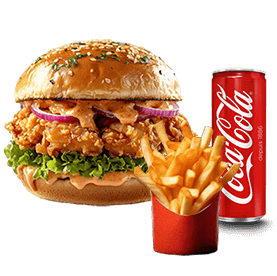 Chicken, 2 fromages + Frites ou potatoes + Sauce au choix + 1 Boisson 33cl au choix.