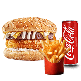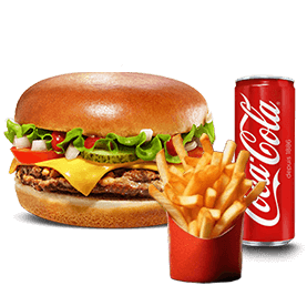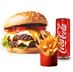 2 Steaks, 2 fromages + Frites ou potatoes + Sauce au choix + 1 Boisson 33cl au choix.
