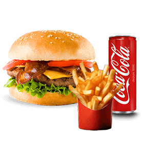 1 Steak, fromage, bacon + Frites ou potatoes + Sauce au choix + 1 Boisson 33cl au choix.