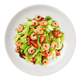 Salade, tomates, avocat, crevettes, citron, vinaigrette.